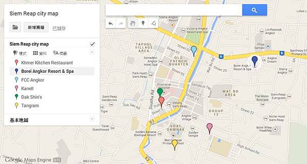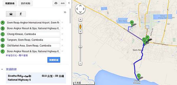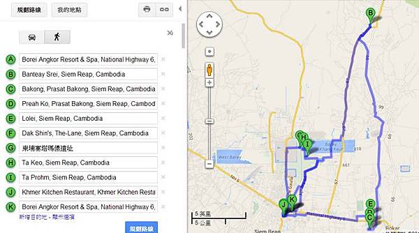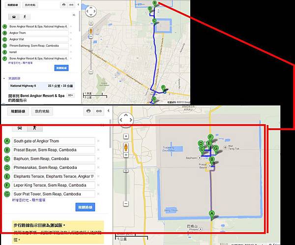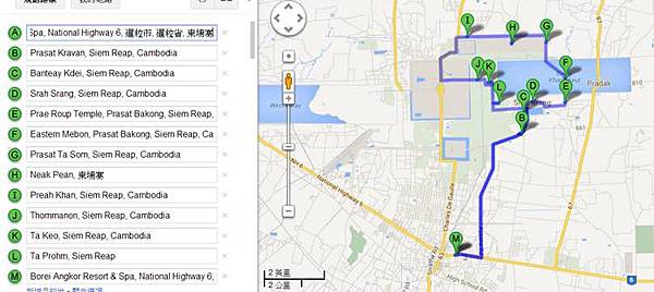 Hotel (Mini Van) à南城門 (Mini Van) à巴戎廟 (Mini Van) à巴普昂寺 (walk) à空中宮殿 (walk) à鬥象台 (walk) à古代法院 (Mini Van) à十二生肖塔 (Mini Van) à The blue pumpkin (Mini Van) à吳哥寺 (Mini Van) à巴肯山看日落 (Mini Van) àKanell (叫車或步行) à Hotel |