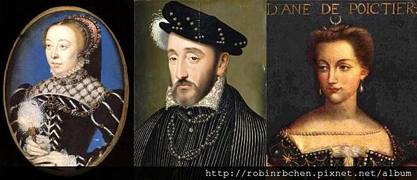 1. 亨利二世與大、小老婆,猜猜看哪位是大老婆凱瑟琳? 哪位是小老婆黛安娜? 從人性的角度看來,亨利對黛安娜意亂情迷似乎並不令人意外啊!