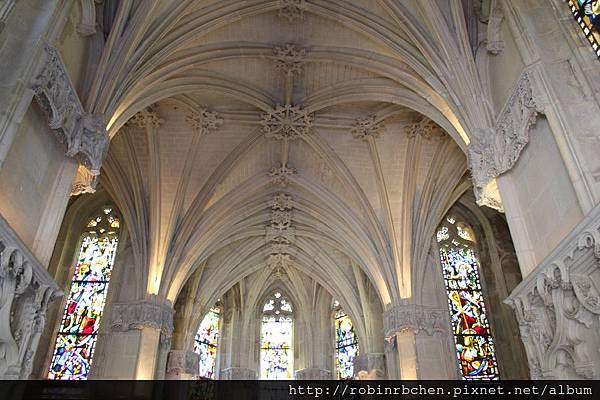 教堂內部有哥德式的拱肋與彩繪玻璃