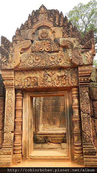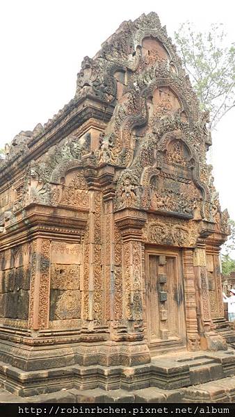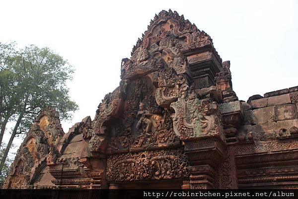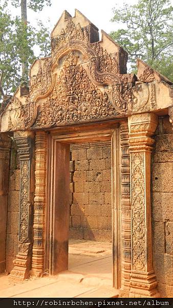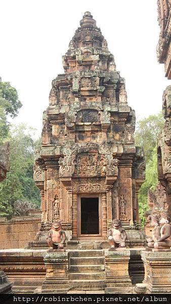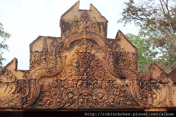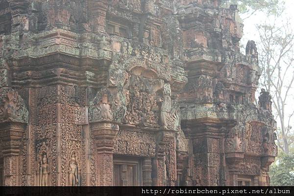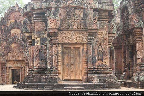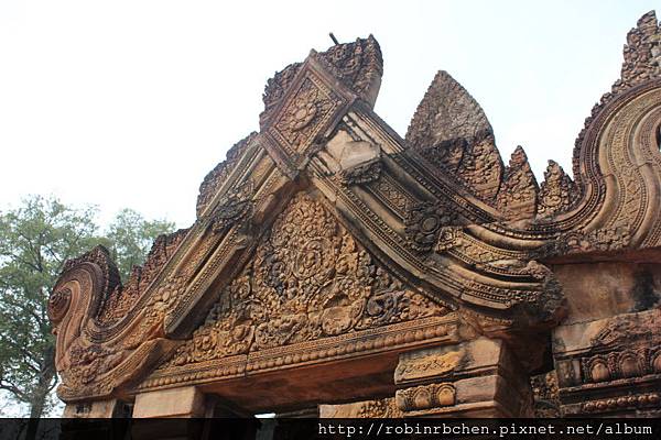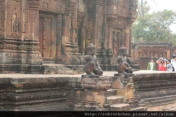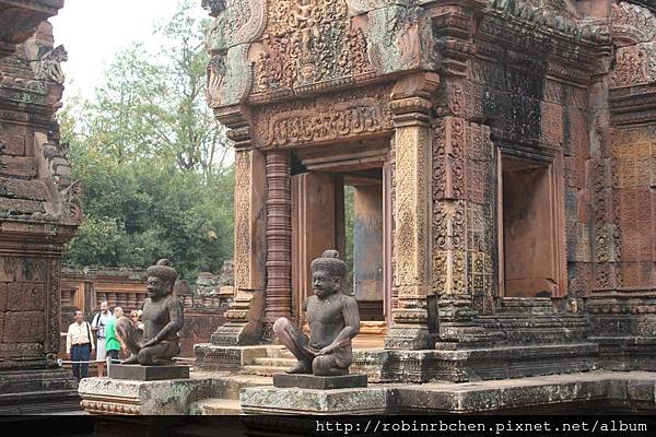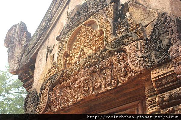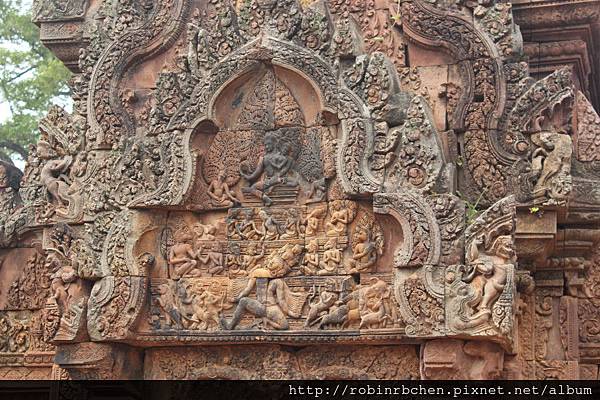 女王宮雖小,但整個寺廟院落與廟門山形牆上,刻滿精緻的浮雕,數量龐大雕工細緻,只能用精雕細琢來形容,很難想像一千多年前,是多少工匠不眠不休的投入,才能在質地堅硬的紅砂岩上,留下這歷經千年的日曬風化,而仍然栩栩如生的刻痕印記。我很喜歡那三層圍牆的廟門山形牆與寺廟廟門上方的浮雕,這裡的浮雕絕對值得多安排一些時間仔細觀賞。