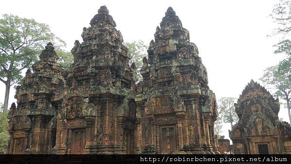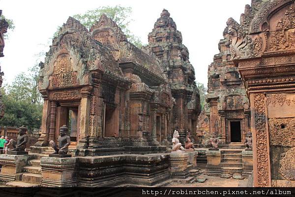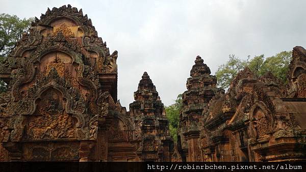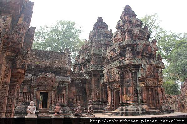 第一層圍牆內是女王宮的中心部分,三座硃紅色的鐘形寺塔由一條巨大的石基連接在一起,所有建築的每一吋表面都刻滿了繁複的浮雕和畫飾。