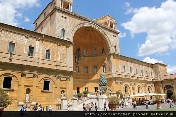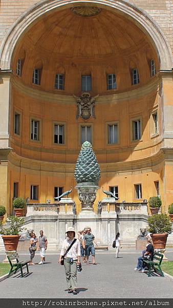 中間這座狀似菠蘿的雕塑,其實是一顆松果,高 4 公尺,原本位於萬神殿,後來搬去聖伯多祿教堂,教堂整修時又搬來這裡。