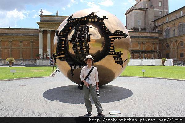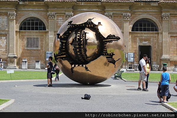 中庭的中央有一棵雙層同心圓大金球,象徵這世界既融和、又分裂,是 1990 年雕刻家 Pomodoro 的作品~~