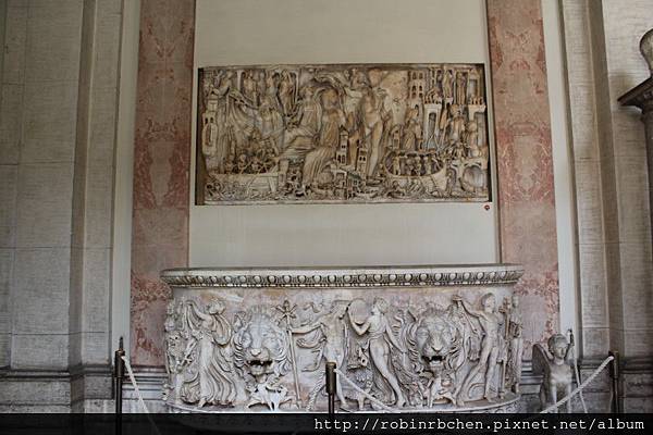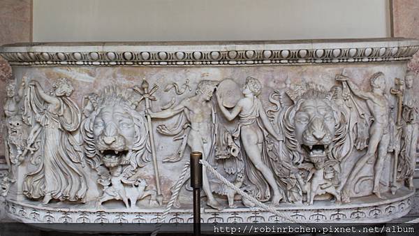在長廊盡頭這座佈滿精緻雕刻的石棺,不清楚其來歷,反正應該就是給達官顯貴使用的啦! 通常會用繩索隔離的藝術品,來頭都不小,隔離的距離愈遠,來頭就愈大!