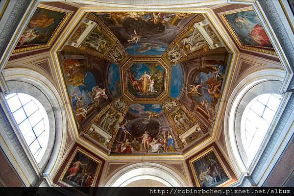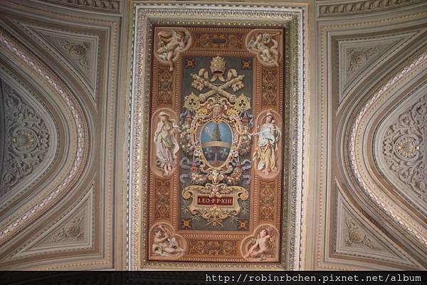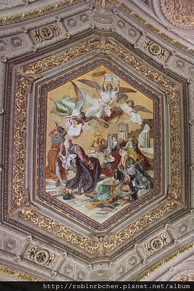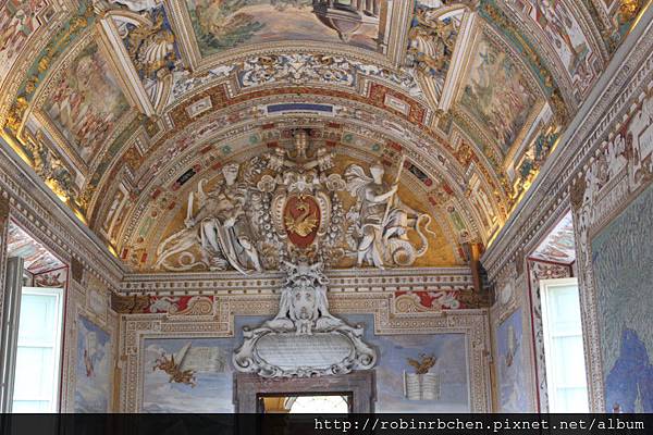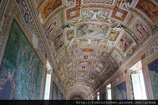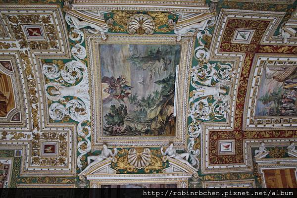 在這裡絕不能錯過的是那金碧輝煌的天花板,整個天花板華麗到了極致,讓整條長廊上的地圖濕壁畫都相形失色了。