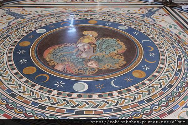 大廳中央的地板上,有一幅智慧女神的馬賽克拼貼畫,色彩繽紛,鮮艷奪目! 中間是智慧女神雅典娜,外圍一圈首次記錄了月亮的陰晴圓缺。