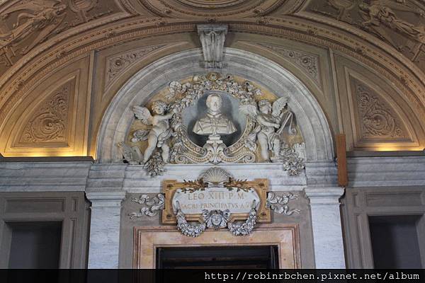 通過燭台陳列廊盡頭的這座教宗李奧十三世的雕像門簷,就進入掛毯長廊。