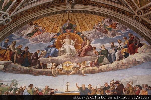這幅〈聖禮的爭辯 Disputation over the Most Holy Sacrament〉是拉斐爾在羅馬所完成的第一幅濕壁畫,上帝位於頂端,上帝的兩側有諸天使;耶穌在上帝下方,兩邊分別是聖母與施洗者聖約翰,旁邊坐著諸使徒與聖人;下方人間是眾多的聖徒,正在爭論著彌撒聖禮......