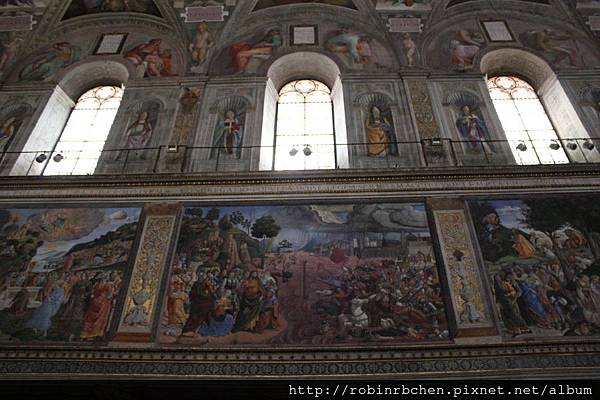 側牆上的壁畫來頭也不小,均是由 15 世紀當代的畫壇菁英,像貝魯吉諾 Perugino、波提且利 Botticelli、羅塞里 Rosselli、吉蘭吉歐 Ghirlandaio 等所繪製,主要述說摩西及基督的聖經故事。