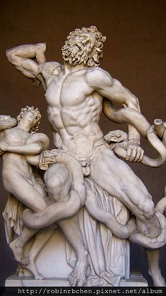 雕像的創作年代眾說紛紜,從公元前 20 年到公元 160 年都有。據說這座雕像是由三位來自羅得島的雕刻家所創作的,述說的是特洛伊祭司拉奧孔,為了說服特洛伊人「木馬」是一個詭計,於是用一把長矛刺向木馬,不料卻導致殺身之禍 ─ 因為這木馬是用於獻祭的聖物,由於觸怒了雅典那女神,拉奧孔與他的兩個兒子,被雅典娜帶來的兩條海蛇纏繞致死......