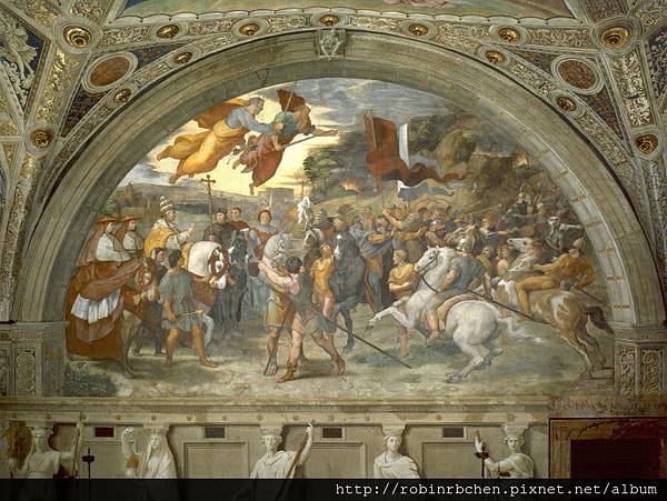 〈康斯坦丁對馬克斯提烏斯的戰役 Battle of Constantine against Maxentius〉,又稱〈十字架顯聖 Vision of the Cross〉,描述戰前康斯坦丁對著士兵信心喊話時,天際突然出現十字架,預告著戰爭的勝利即將到來~~