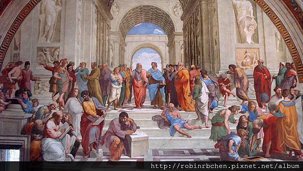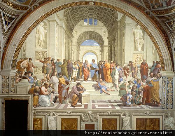 〈雅典學院 School of Athens〉被公認是拉斐爾最經典的作品,拉斐爾巧妙地連結了前方真實的半圓形拱門與後方畫作內的階梯與建築,並運用透視手法,加強了整個畫面的縱深。