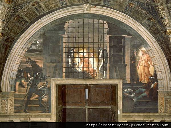 整幅壁畫結合了透視法與視覺錯覺的手法,再輔以戲劇性衝突的場景,營造出天使營救聖伯多祿出獄時,驚險緊張的故事氛圍。