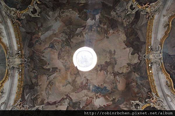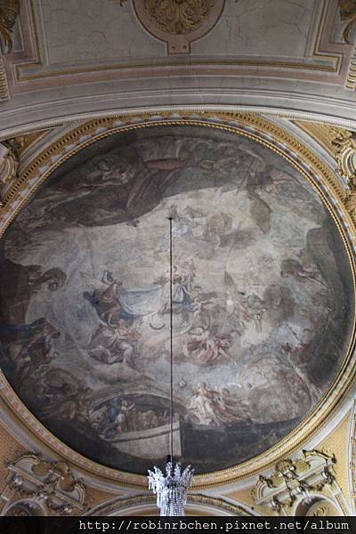 階梯大廳,天花板上繪製的溼壁畫,總面積達600平方米,當年是出自威尼斯畫家堤波羅(Giovanni Battista Tiepolo)之手。只是目前所見,應該也是重建後所繪製的。