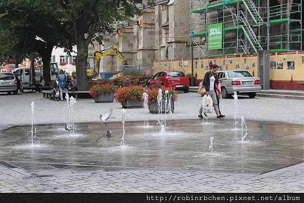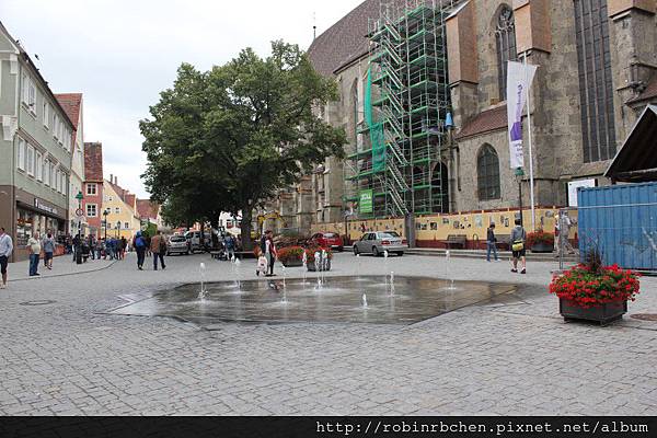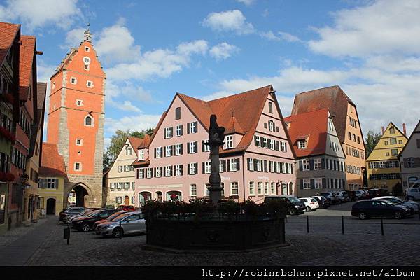 我們把GPS的座標,設定在丁克爾斯比爾市中心的聖喬治教堂(St. Georg),GPS帶領我們從最接近市中心的Wornitztor 城門進城。一進城,在一個噴泉水池小廣場旁邊就有不少停車位,看一下GPS,距離聖喬治教堂僅剩100公尺,於是二話不說,立馬把車停在小廣場上。