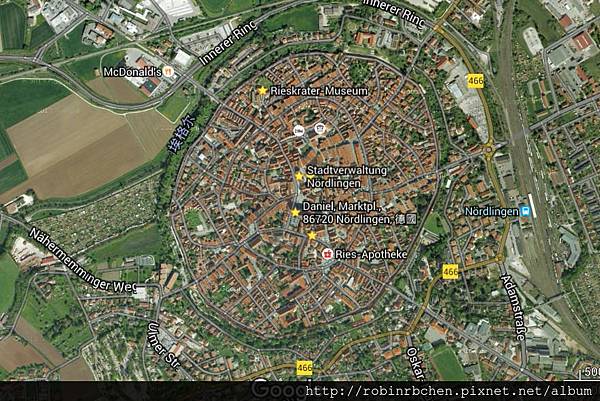 諾德林根除了是一個中世紀小鎮之外,還有一個特點,就是它是位於一個1500萬年前形成的隕石坑上的小鎮。也因為她所在的位置是隕石坑,所以有別於其他中世紀城鎮,因應地貌而建造不規則形狀的城牆,諾德林根的城牆,形成一個非常完整的橢圓形,大致上就是隕石坑的形狀吧?!