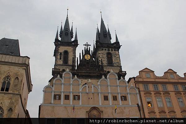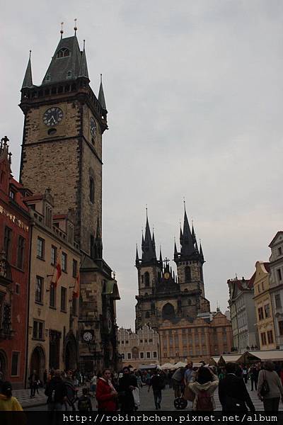 從這個角度,也可以看到舊城廣場另一端的地標建築:擁有哥德式雙塔的提恩教堂。