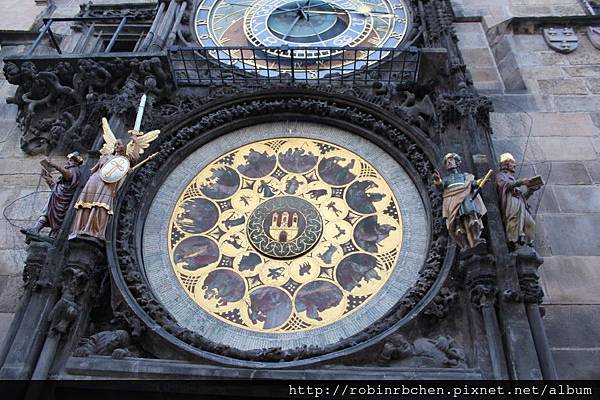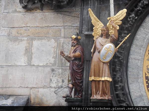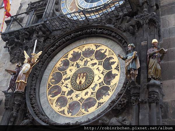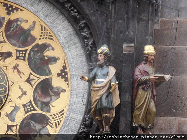 天文中最上面的兩個窗戶,每到整點就會打開,此時死神開始鳴鐘,耶穌的12門徒的木偶在窗戶內一一現身,最後以雞鳴和鐘響結束。看一小段影片囉...