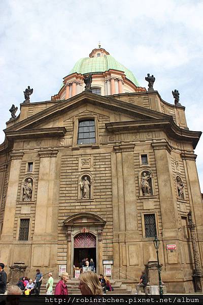 在舊城橋塔廣場旁的聖方濟教堂(svaty Frantisek z Assissi),呈現出多種建築風格融合的面貌:整體而言是文藝復興風格,上方加了一個新古典風格的希臘式三角楣,最上方再加上一個巴洛克式大圓頂。