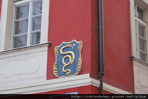 小廣場的另一端,矗立著一棟紅色的醒目房舍,稱為金蛇之屋,因為這棟房舍的轉角牆面裝飾了一枚金蛇徽飾~~