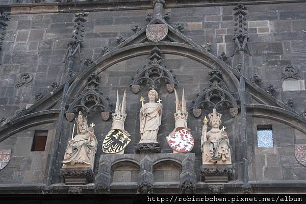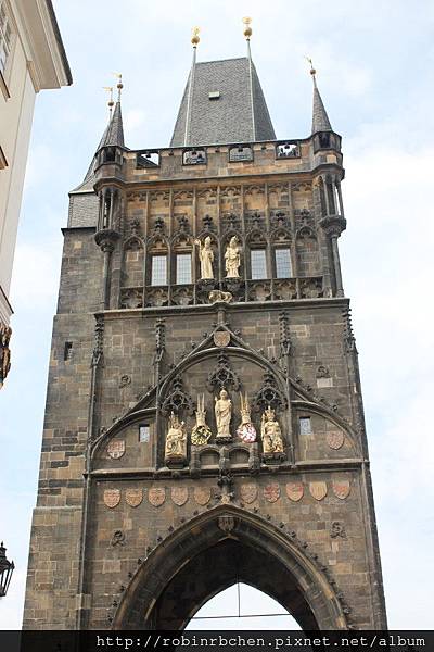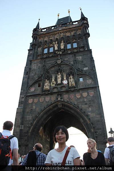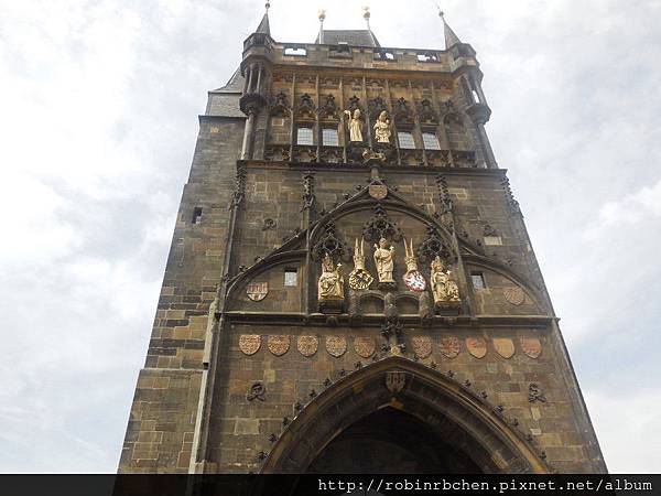 舊城橋塔在牆面上有金色的哥德式雕像,其中包括把布拉格帶向當時歐洲第一大城的查理四世。