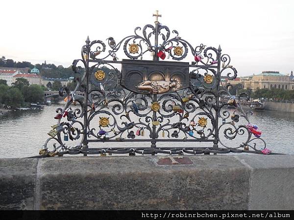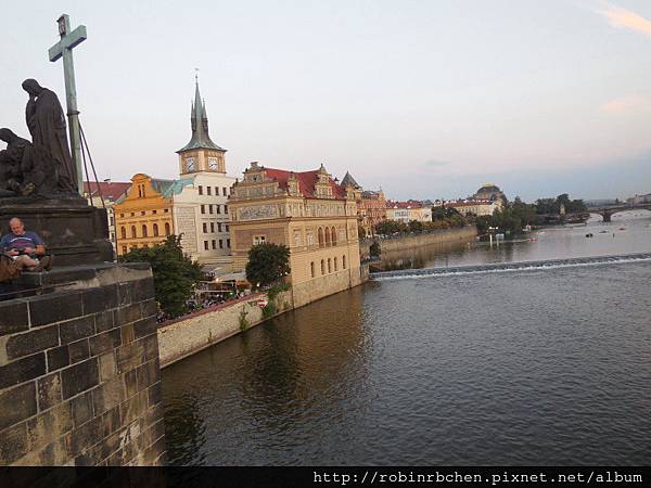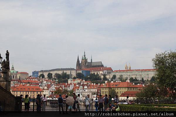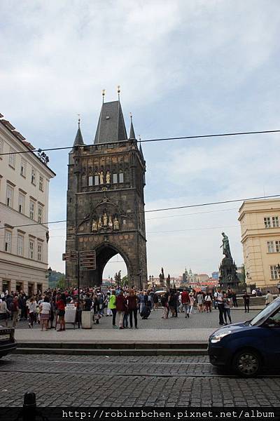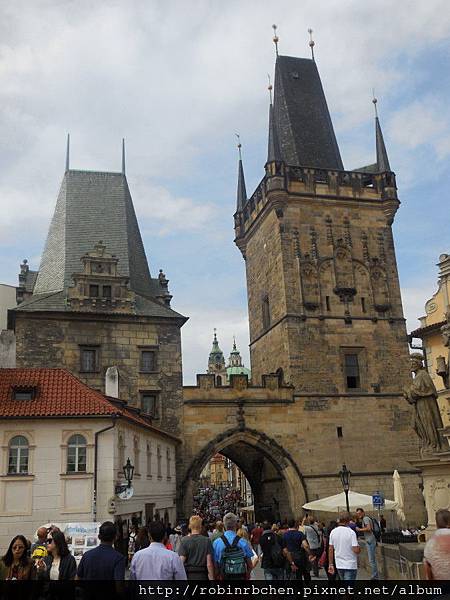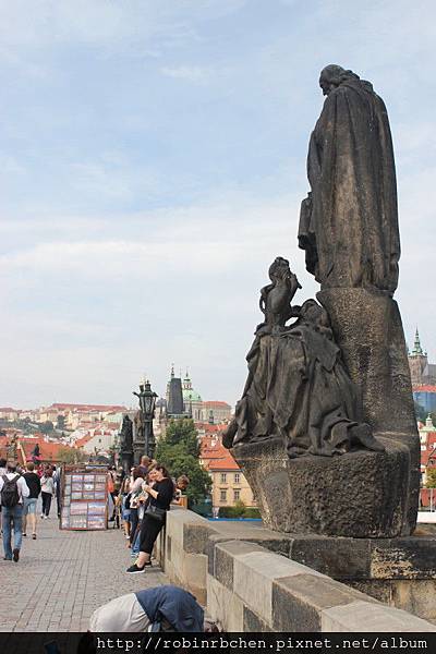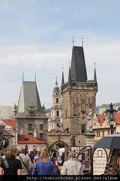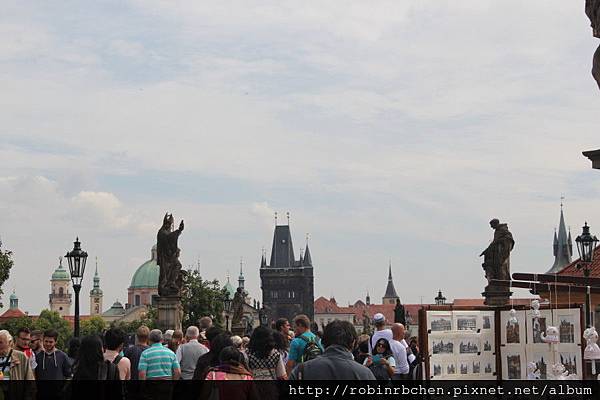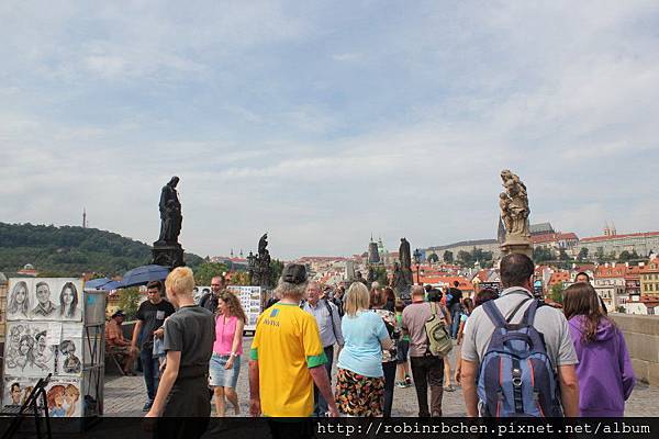 終於踏上查理大橋(Karluv most)了,而這絡繹不絕的人潮,密度也在這裡達到最高點,加上橋樑兩側路面擺滿了素描攤、藝品攤,還有街頭藝人劃地為王、佔據地盤,讓整個橋面塞得水洩不通。