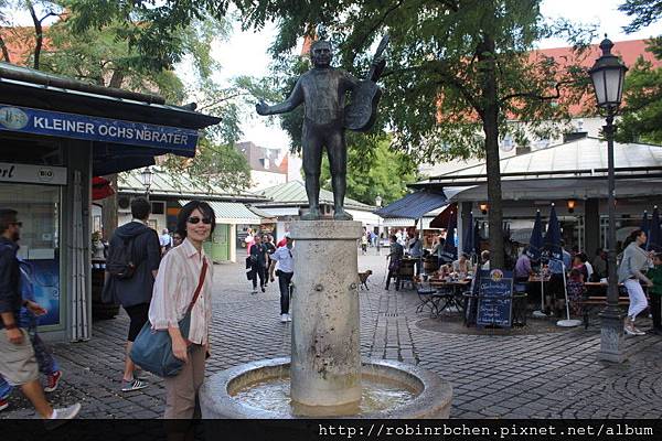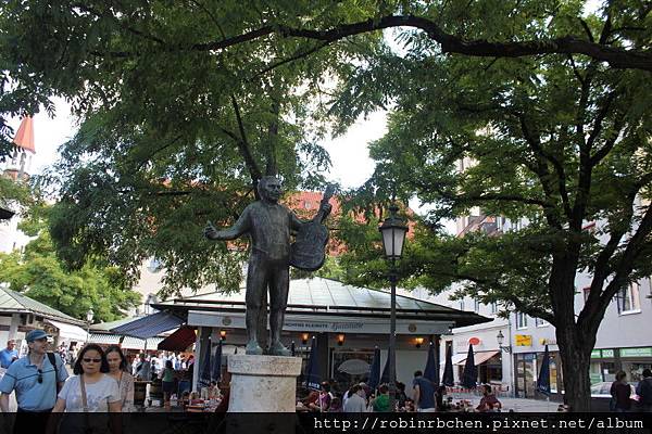 市集當中的一座噴泉,據說是紀念一位巴伐利亞的民俗音樂家。