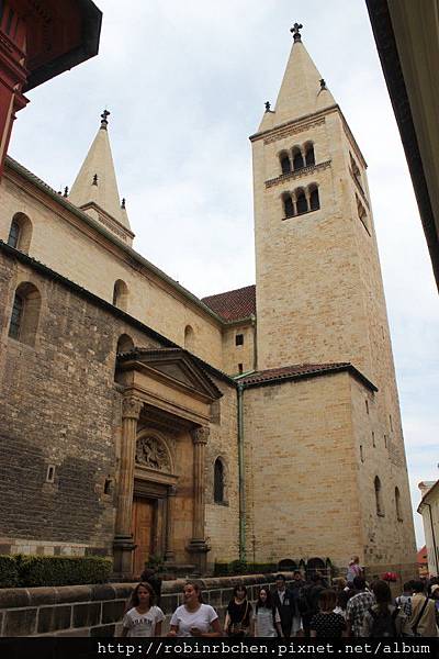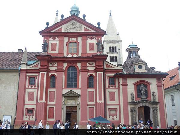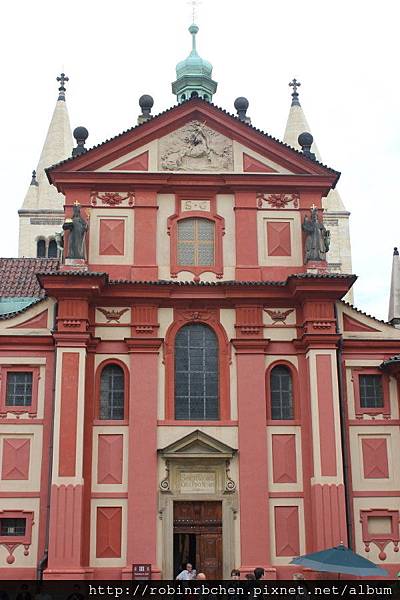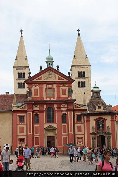 這座擁有雙塔的紅色建築是聖喬治教堂(Basilica of St. Jiri),也是布拉格保存最好的仿羅馬式建築,始建於920年,依古羅馬會堂的形式建造了中央的主結構。之後經歷多次改建與整修,陸續在12世紀增建了後方的哥德式雙塔、14世紀加上了聖路得米拉廳、17世紀重建了正面的裝飾牆面......