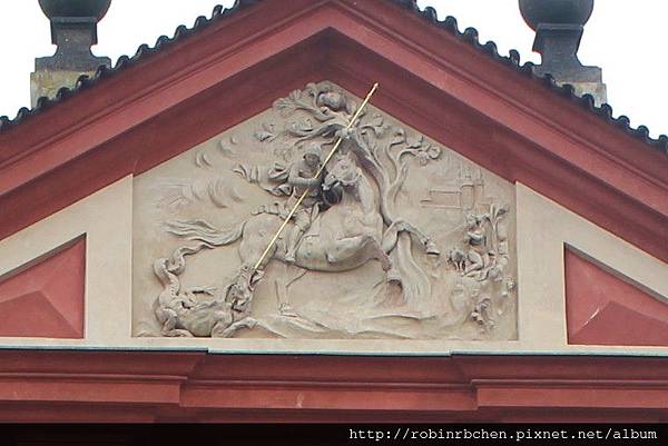 大門上方的三角楣當中,有一面「聖喬治騎馬降龍」的石刻浮雕。