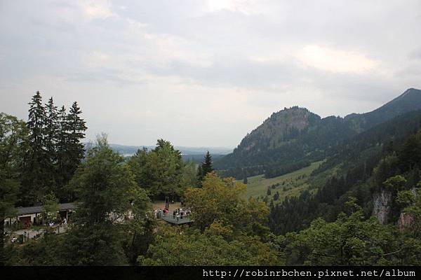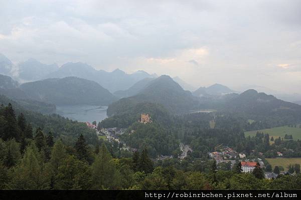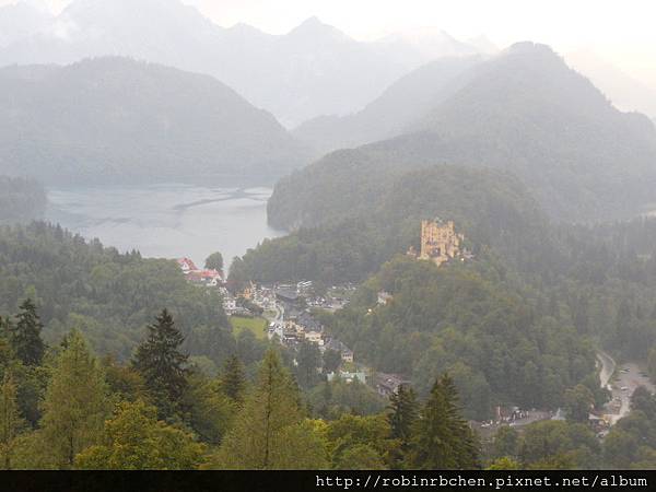 這是導覽結束後,從城堡內的紀念品店附近,俯瞰舊天鵝堡與阿爾卑斯湖(Alpsee)。