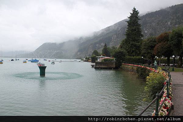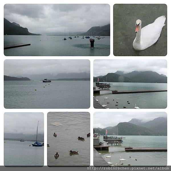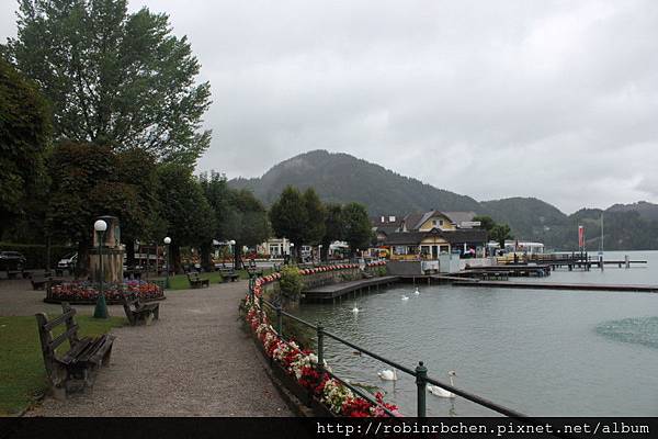 前往湖區的這天,一路上陰雨綿綿,到達聖吉爾根時,依然是下著小雨,沃爾夫岡湖面,像是蒙上一層薄薄的面紗。這小鎮的規模很小,當地人口僅三千多人,所以停車也非常方便,直接把車停在湖畔的道路邊,然後就直接沿著沃爾夫岡湖散步。