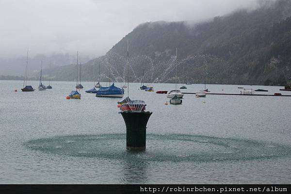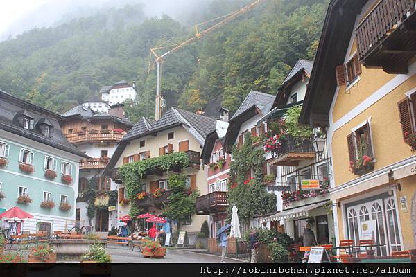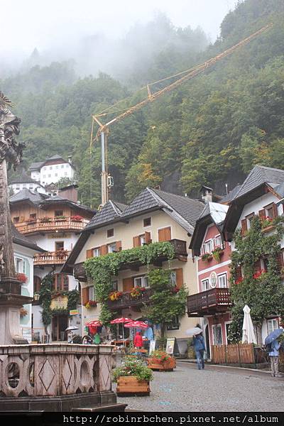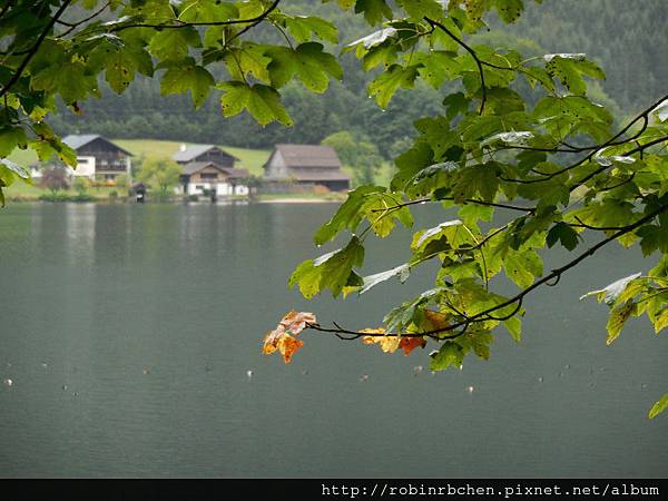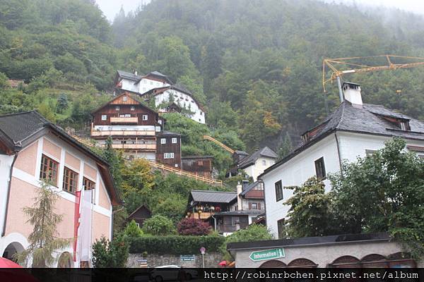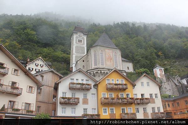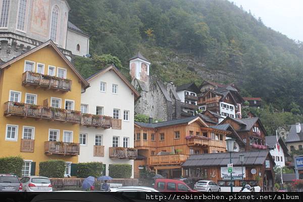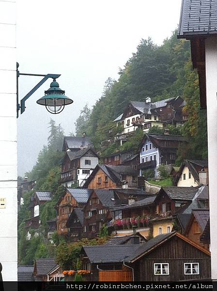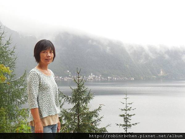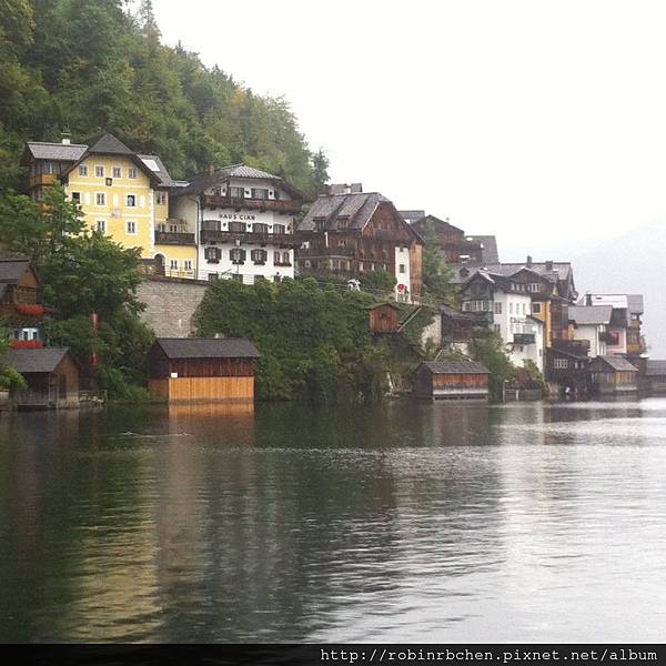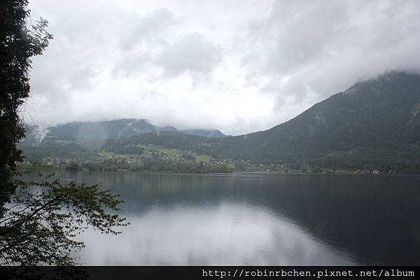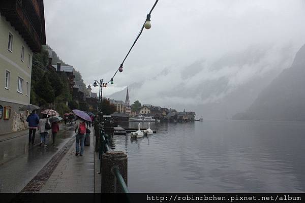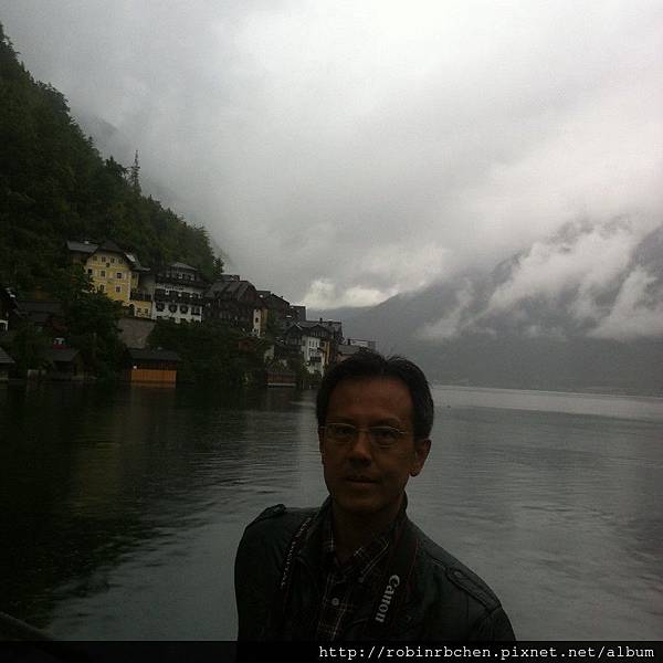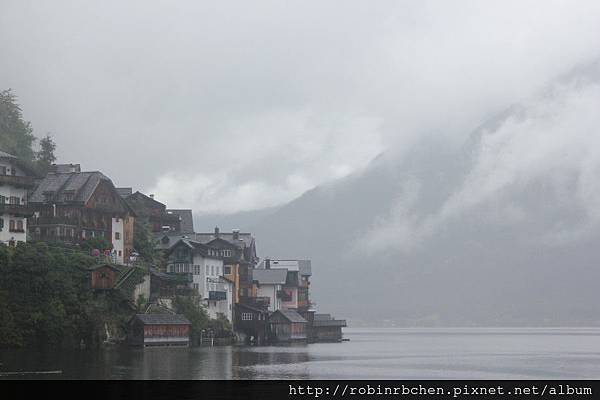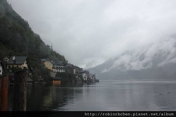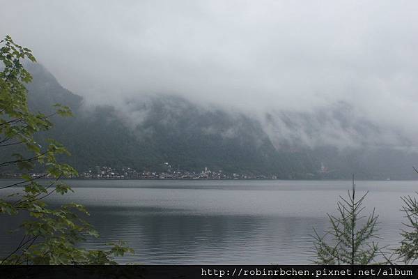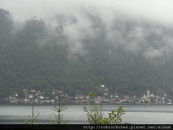 從南邊隧道口附近的碼頭,可以遠眺哈修塔特市中心,這也是風景月曆或明信片常見的角度之一,可惜當天陰雨綿綿、雲霧飄渺,所有的山水景物都蒙上了一層薄紗~~