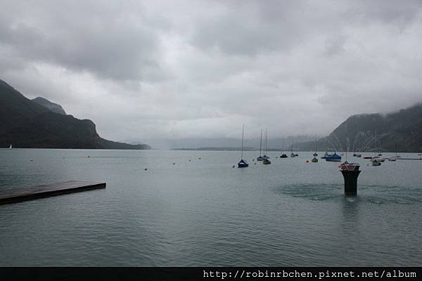 湖面上的帆船,因雨壞了揚帆的興致,紛紛收起船帆,把船身覆蓋上防水布,靜靜停泊在碼頭附近。