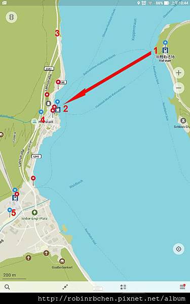 另一種方式是開車,開車由北邊進入哈修塔特前,會先經過一條長隧道,在北邊隧道口(編號3)附近有一個進入小鎮的標示牌與閘門,只有鎮上居民或是在鎮上住宿的遊客才可把車開進閘門,其他車輛一律須進入隧道,在隧道中心附近,有一個停車場(編號4),在這裡停車後走下階梯,就是鎮中心的市集廣場。我們當時錯過了這個停車場,直接開出隧道,後來把車停在鹽礦博物館附近的停車場(編號5),然後再徒步走回鎮中心的市集廣場。