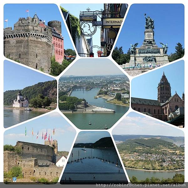 萊茵河中游,從科布倫茲(Koblenz)到賓根(Bingen am Rhein,左岸) / 呂德斯海姆(Rudesheim am Rhein,右岸)之間,沿岸低海拔的山坡地滿佈著翠綠的葡萄園;山頭上的險要之地,則林立著數十座中世紀城堡,是昔日的兵家必爭之地。這些城堡有的頹圯荒蕪,有的重整後供人參觀,有的則整建為星級旅館或青年旅館,各有不同的風情~~