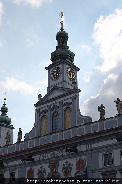 市政廳的屋頂中央,同樣裝飾著一座具有波希米亞特色的山牆;三支蔥型塔樓,也是擁有波希米亞特色的巴洛克尖塔。