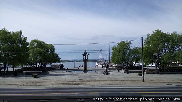 面向峽灣的市政廳廣場,除了噴泉、雕塑之外,也設置了前往峽灣鄰近地區的渡輪碼頭,包括前往比格迪區的渡輪,也是在此搭乘。
