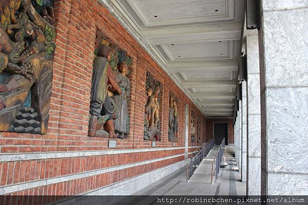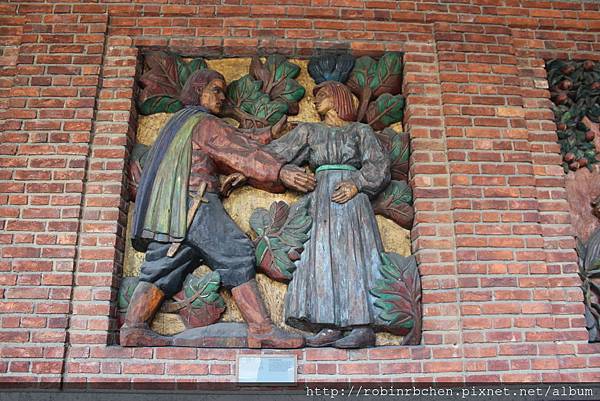 正面兩側的一樓長廊牆面,裝飾了16幅巨型木雕,述說著北歐的神話故事。