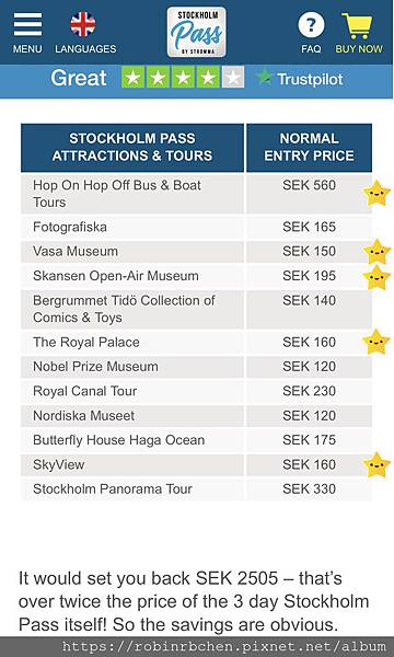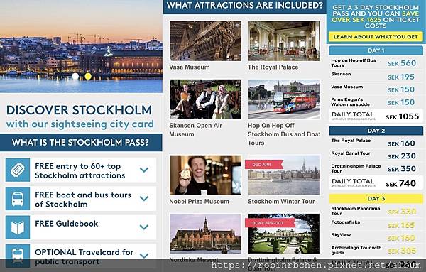 提供超過60座博物館與遊程可供參觀,官網上列出了部分熱門博物館與遊程的價格供參考,僅以下表官網列出的項目加總,門票價值就達2505 SEK,如果能參觀得更多,就更划算!!