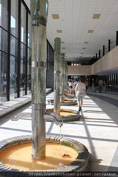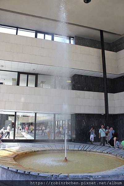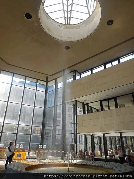 另外還有一座室內溫泉噴水池,這是一座間歇泉,泉水來自地下2500公尺,溫熱的泉水造成周遭瀰漫著氤氳霧氣,水氣裊裊上升,同時也擴散凝結在帷幕玻璃上......