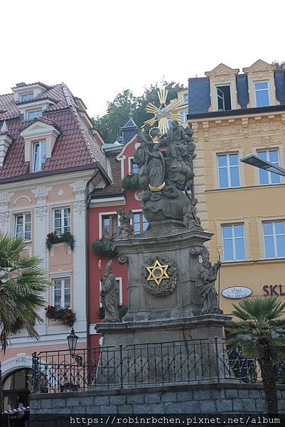 市集溫泉迴廊的前方有一座猶太教雕塑小廣場 (Sloup Nejsvetejsi Trojice)