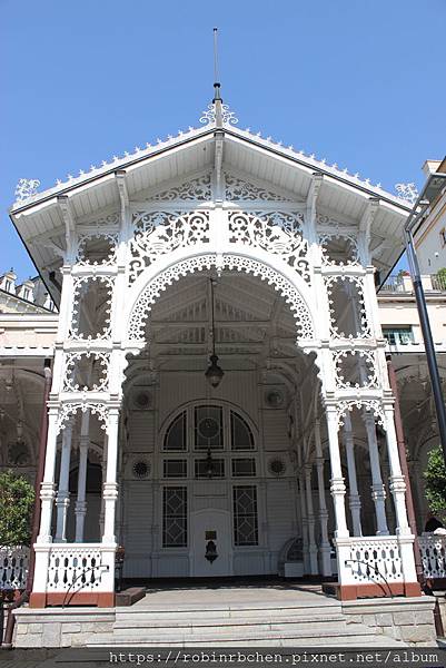 市集溫泉迴廊採用像蕾絲般的白色鑄鐵裝飾,讓整座迴廊流露出奢華的藝術氣息!