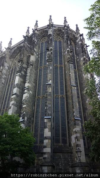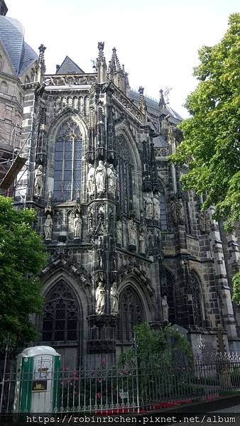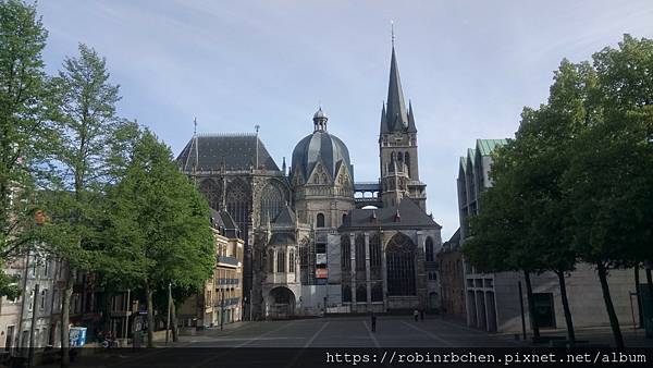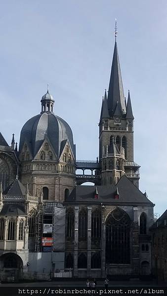 【亞琛大教堂】是由許多不同時期建築藝術組合而成的主教座堂,遠遠望去,很明顯的可以看到哥德式尖頂、巴洛克式圓頂、頂著拜占庭式馬賽克拼貼屋頂的哥德式花窗長廊。