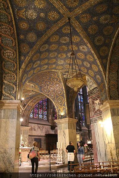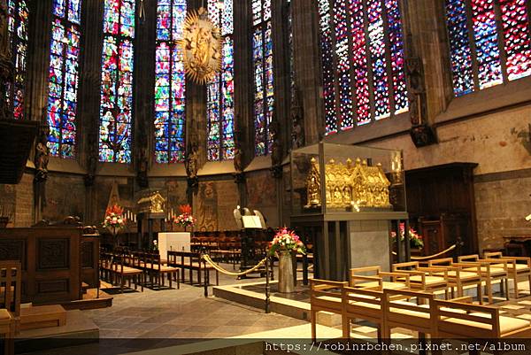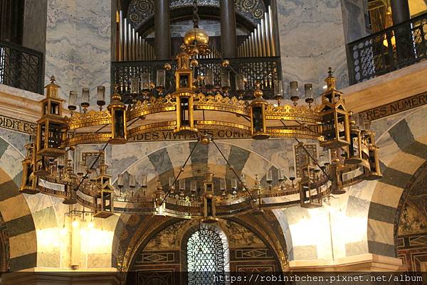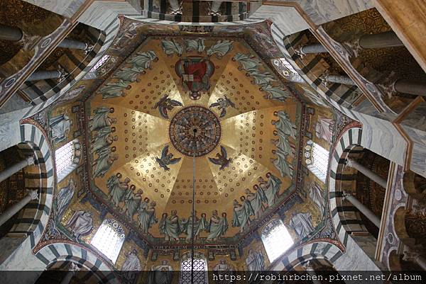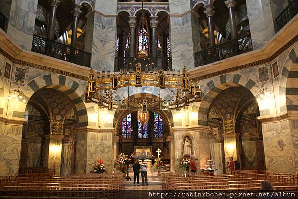 西元786年,查理曼大帝在教宗的授權下,把大理石遠從義大利運到亞琛,造就了這座金碧輝煌的教堂。